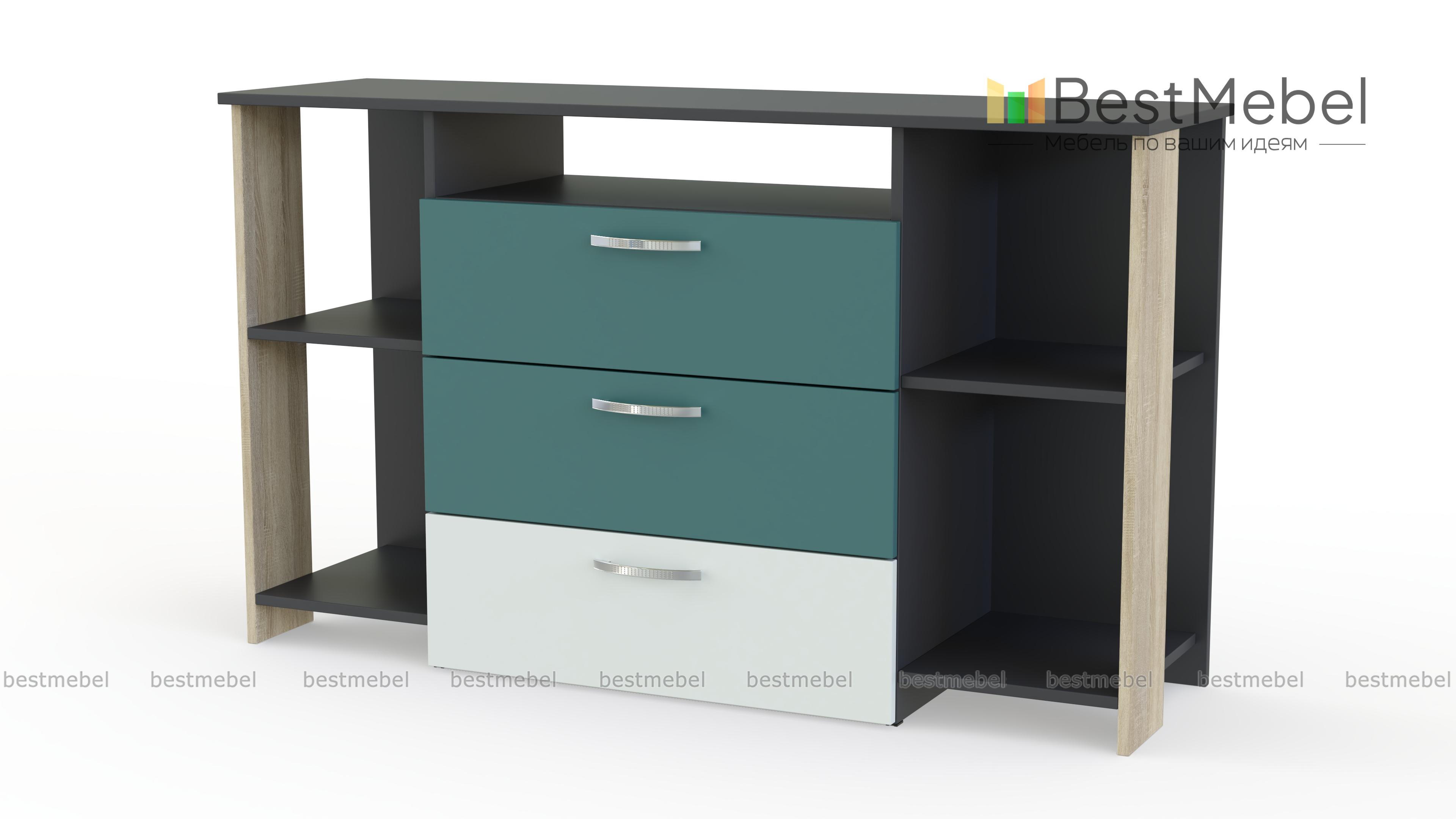 Комод Дабл 3 BMS дополнит интерьер современной спальни или гостиной и поможет разместить большое количество вещей, а также оформить зону ТВ. Комбинированная модель оборудована широкой столешницей, тремя выдвижными ящиками, нишей под аппаратуру и открытыми боковыми секциями для книг или декоративных мелочей. Корпус светлого древесного оттенка дополняет фасад в белом и графитовом цвете. Купить комод Дабл 3 BMS по доступной цене вы сможете в нашем интернет-магазине.