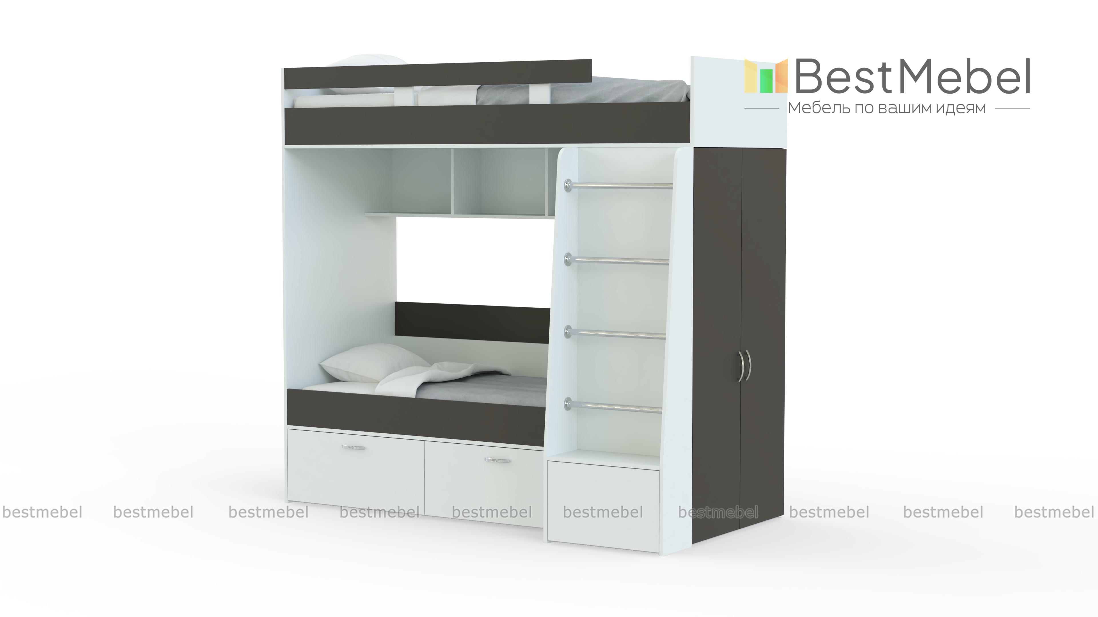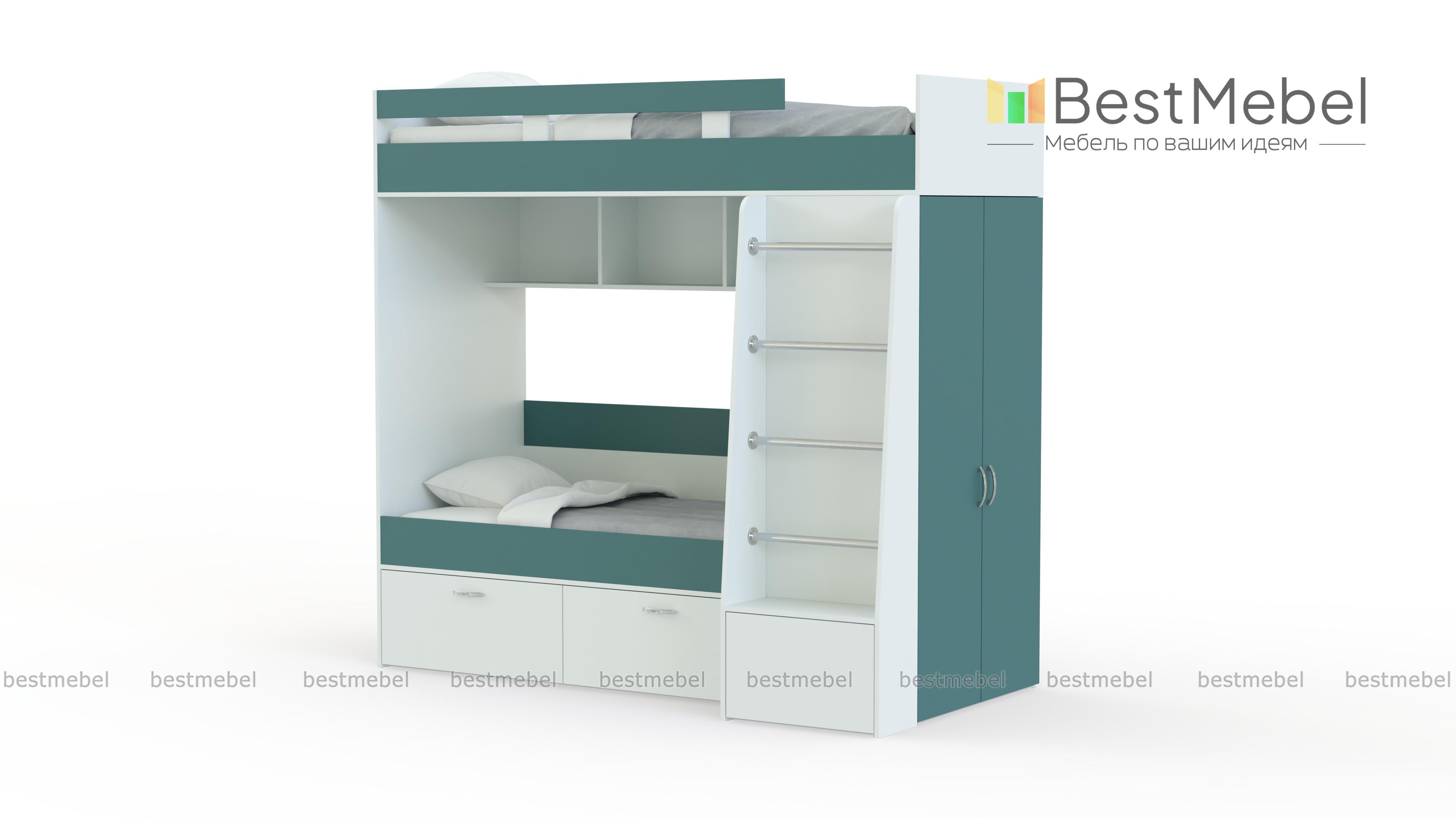 Двухъярусная кровать Белла 6 со шкафом BMS – недорогой современный комплект, который подарит малышам полноценный здоровый сон. Спальное место второго яруса ограждено защитным бортиком, вниз ведет удобная устойчивая лестница. Для хранения предметов гардероба предусмотрен встроенный шкаф, а игрушки и книги смогут расположиться на открытых полках между ярусами и за спинкой кровати. Купить двухъярусную кровать Белла 6 со шкафом BMS в подходящей расцветке вы сможете в нашем интернет-магазине.