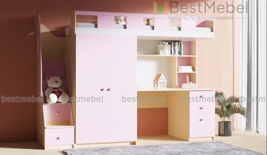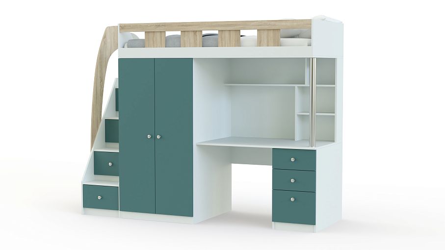 Кровать-чердак с рабочей зоной Клаус 13 BMS станет практичным решением для экономии пространства детской. На втором ярусе располагается просторное спальное место с бортиком, а первый занимают рабочая зона с письменным столом и полками, распашной шкафчик для одежды и лестница-комод с ящиками для игрушек и прочих вещей ребенка. Корпус светлых тонов дополняют цветные фасады, углы кровати безопасно скруглены. Купить кровать-чердак с рабочей зоной Клаус 13 BMS приглашаем в наш интернет-магазин.