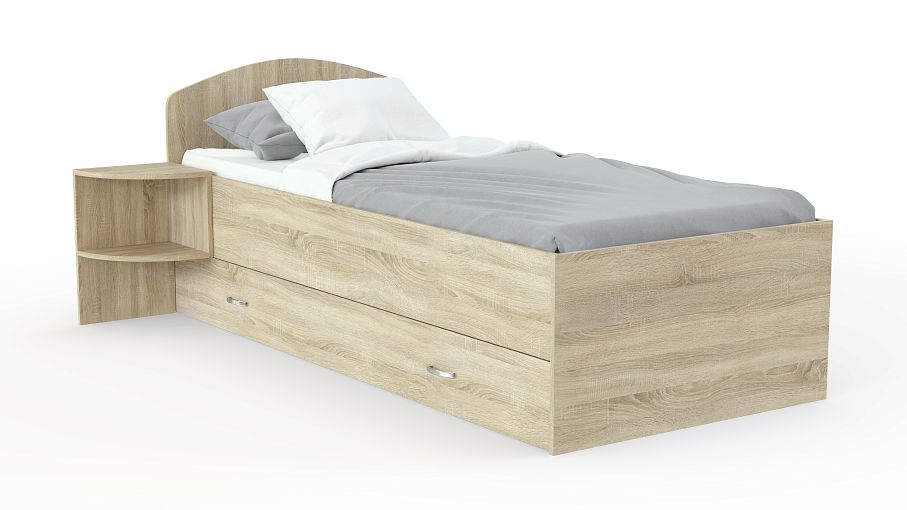 Кровать Mebi BMS – универсальная модель для интерьера современных молодежных комнат. Кровать выполнена в светлых древесных тонах и оборудована просторным спальным местом без спинки в изножье и низким скругленным изголовьем. Для удобного размещения в зоне быстрого доступа книг, журналов и необходимых мелочей модель дополнена открытыми полками, а для хранения постельных принадлежностей предусмотрен широкий ящик в основании. Купить кровать Mebi BMS и эффективно использовать пространство вам всегда поможет наш интернет-магазин.