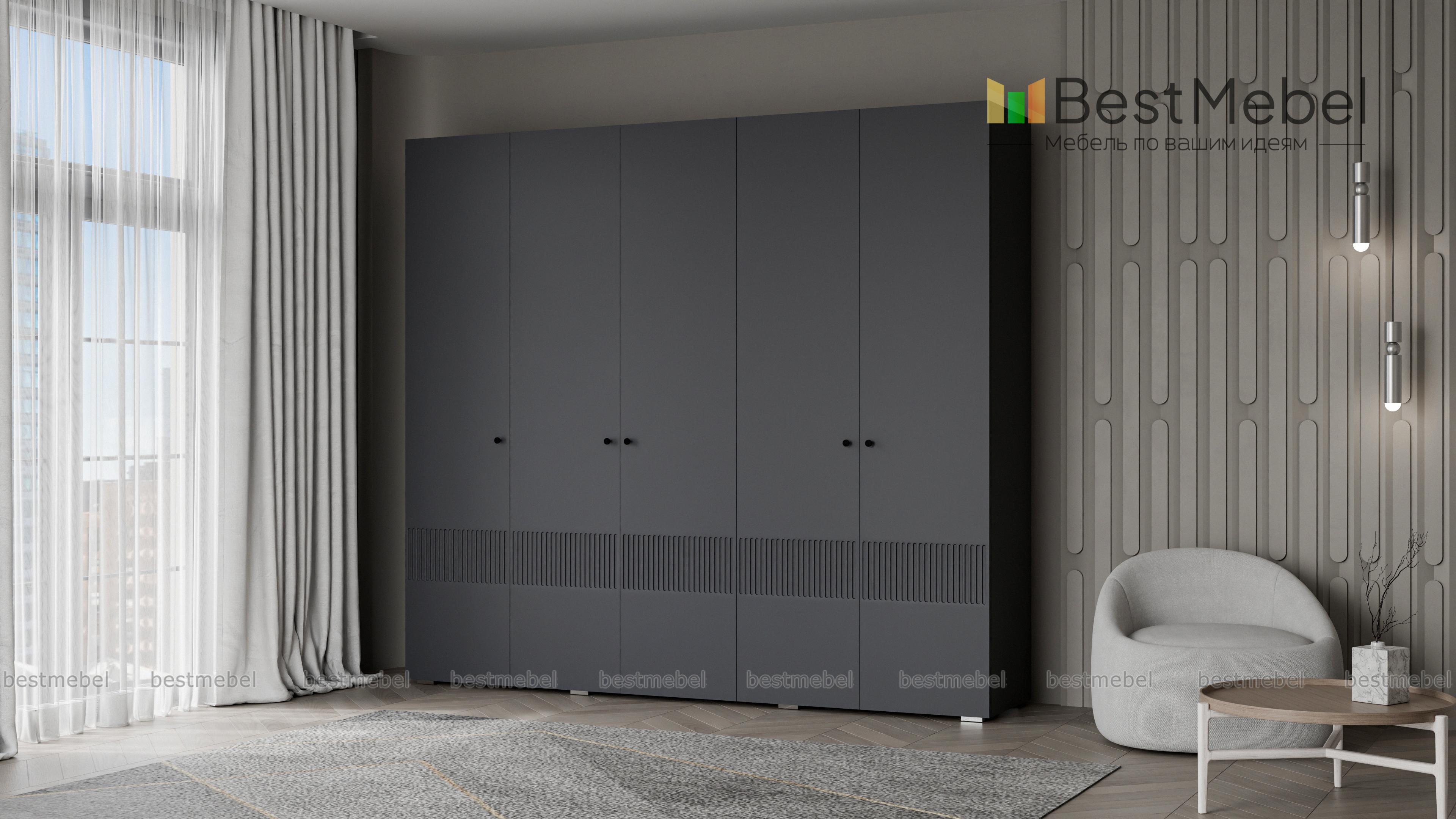 Шкаф распашной Джосс 5 BMS — это яркая современная модель с цветным фасадом и фрезеровкой. Комплектация с двумя штангами и полками подходит как для сложенной, так и развешанной на вешалках одежды, а также обуви и коробок с аксессуарами. С помощью этого пятидверного шкафа вы сможете удобно и эстетично организовать хранение гардероба для двух человек. Купить шкаф распашной Джосс 5 BMS с выбором размеров, цвета и фурнитуры приглашаем к нам в интернет-магазин.