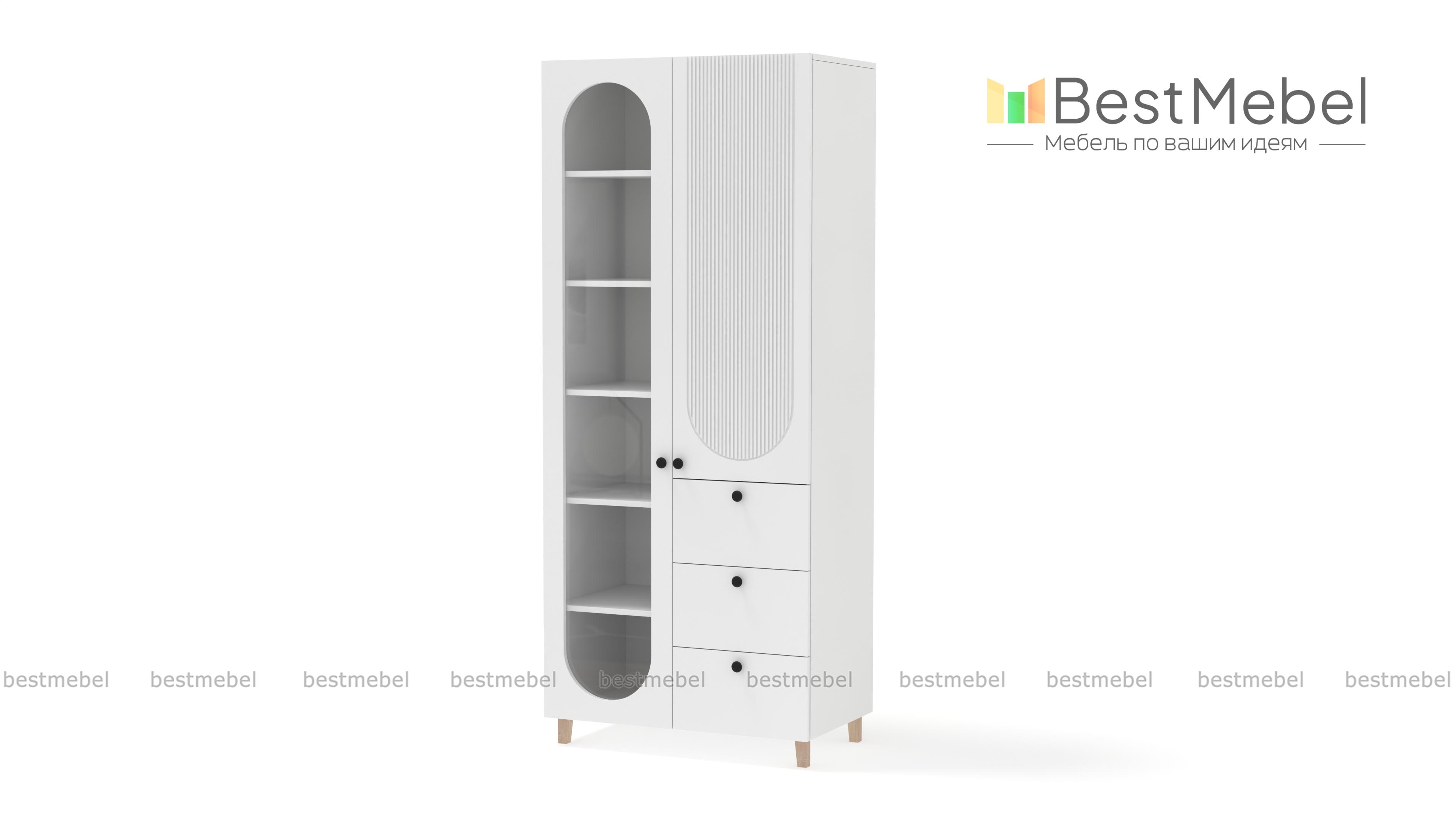 Шкаф распашной Рене 7 BMS поможет грамотно спланировать хранение в детской или гостиной. На полках за стеклом с овальным вырезом будут красиво представлены книги, предметы коллекции и декоративные мелочи, а для прочих вещей предусмотрены закрытая секция и ящики. Шкаф с высокими ножками выполнен в актуальной палитре, оригинальный рельеф на фасаде завершает стильный образ. Купить шкаф распашной Рене 7 BMS, изготовленный по индивидуальным размерам, приглашаем в наш интернет-магазин.