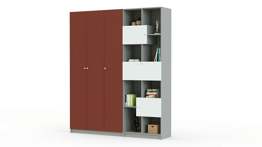 Шкаф-стеллаж Шелби-8 BMS – это трехдверный распашной шкаф с полками и оригинальный стеллаж с асимметрично расположенными открытыми и глухими секциями. Комбинированная модель поможет разместить домашний текстиль, бытовые мелочи, книги и предметы декора, а также легко найти нужную вещь. Эффектным решением для современных интерьеров станет сочетание серых тонов и яркого контрастного терракотового оттенка. Купить шкаф-стеллаж Шелби-8 BMS и оптимизировать хранение вам поможет наш интернет-магазин.
