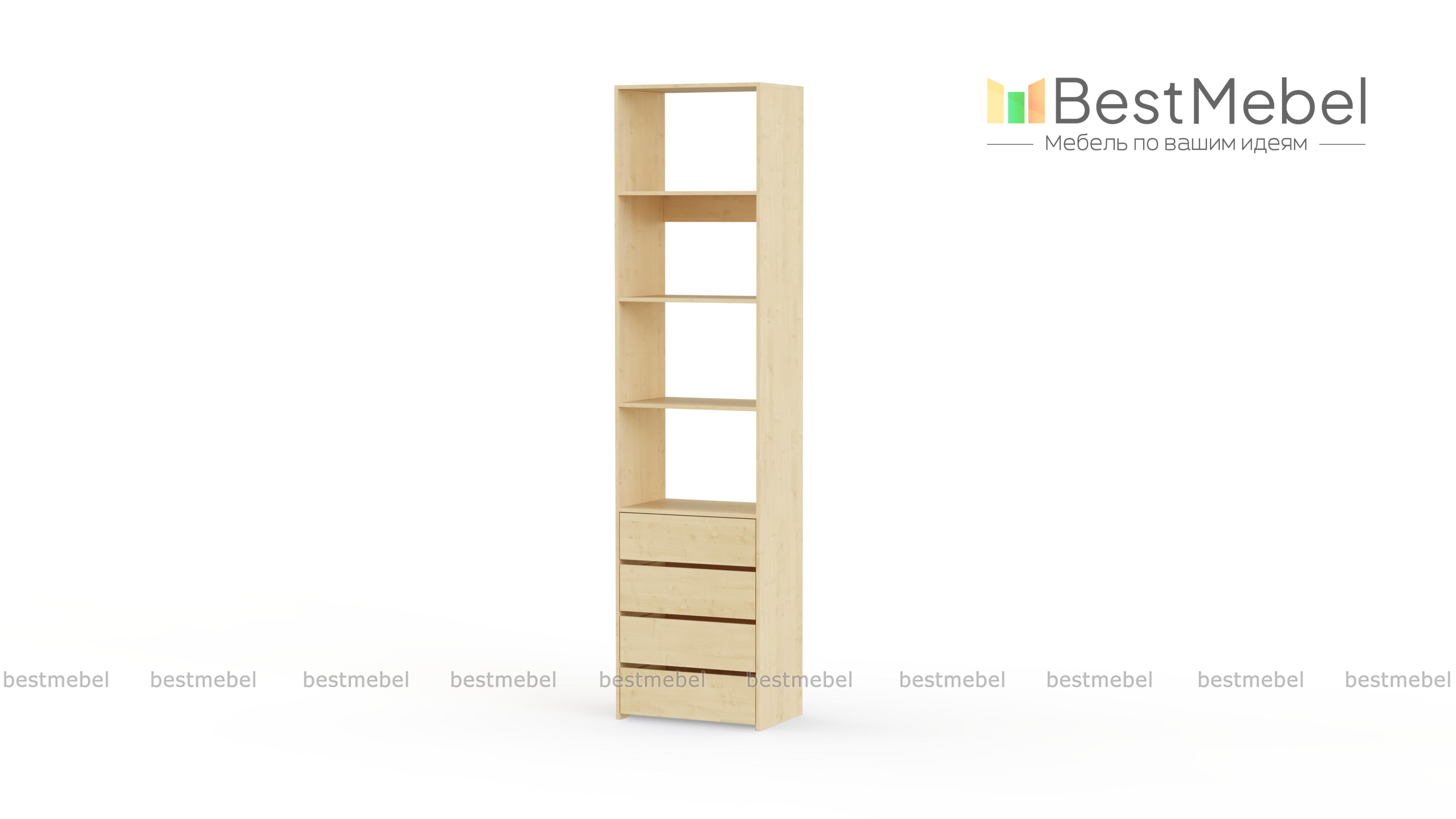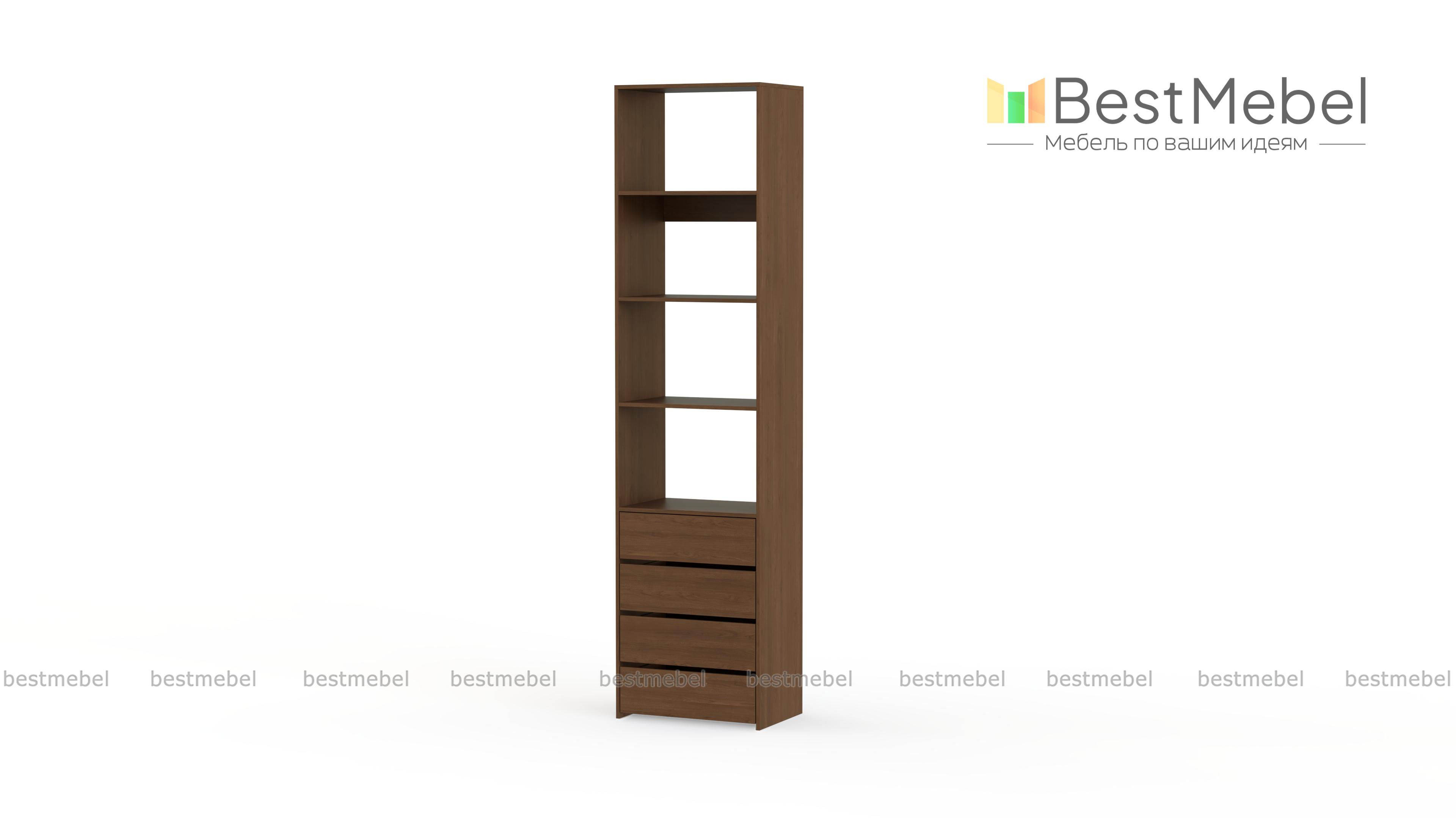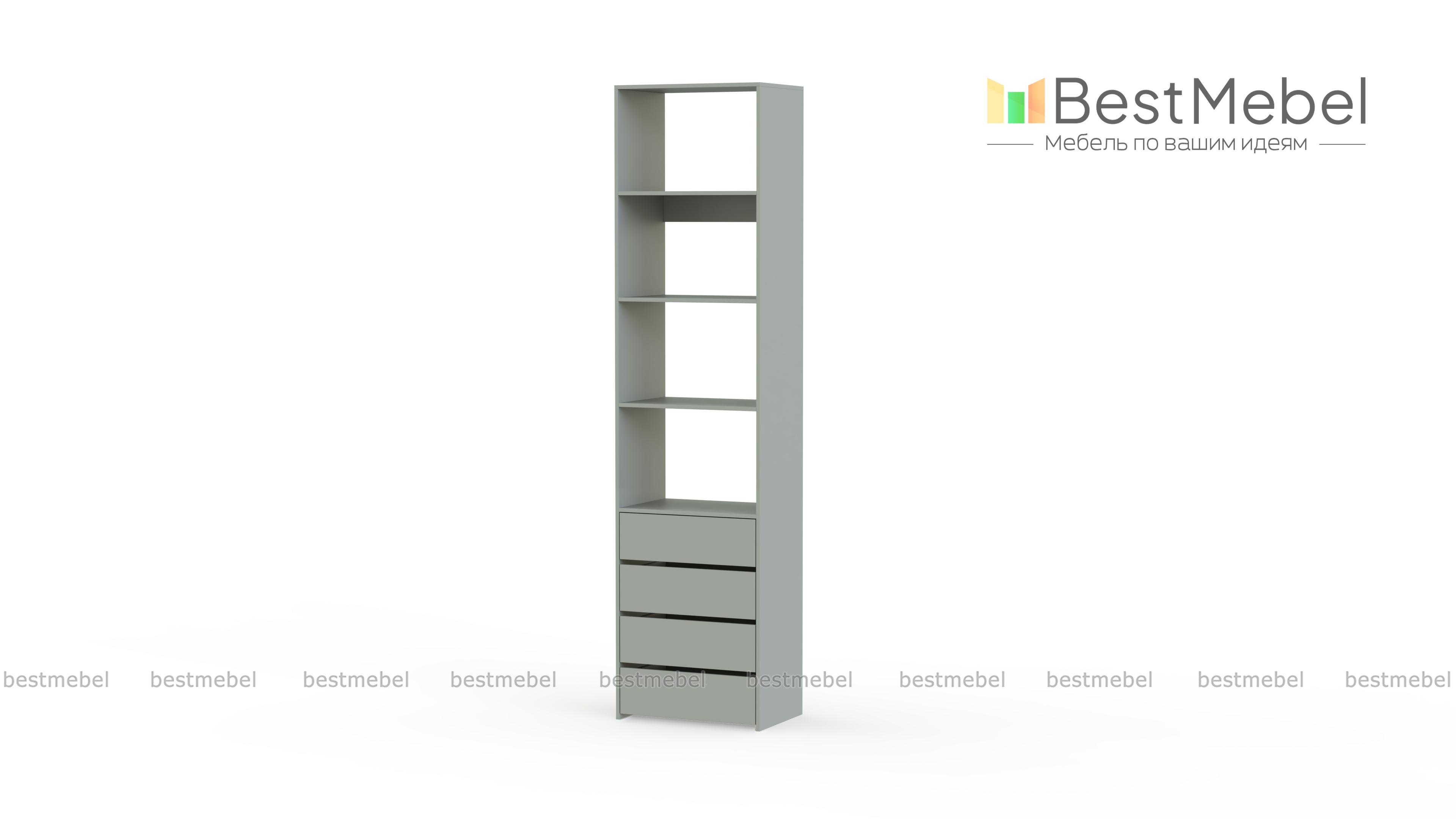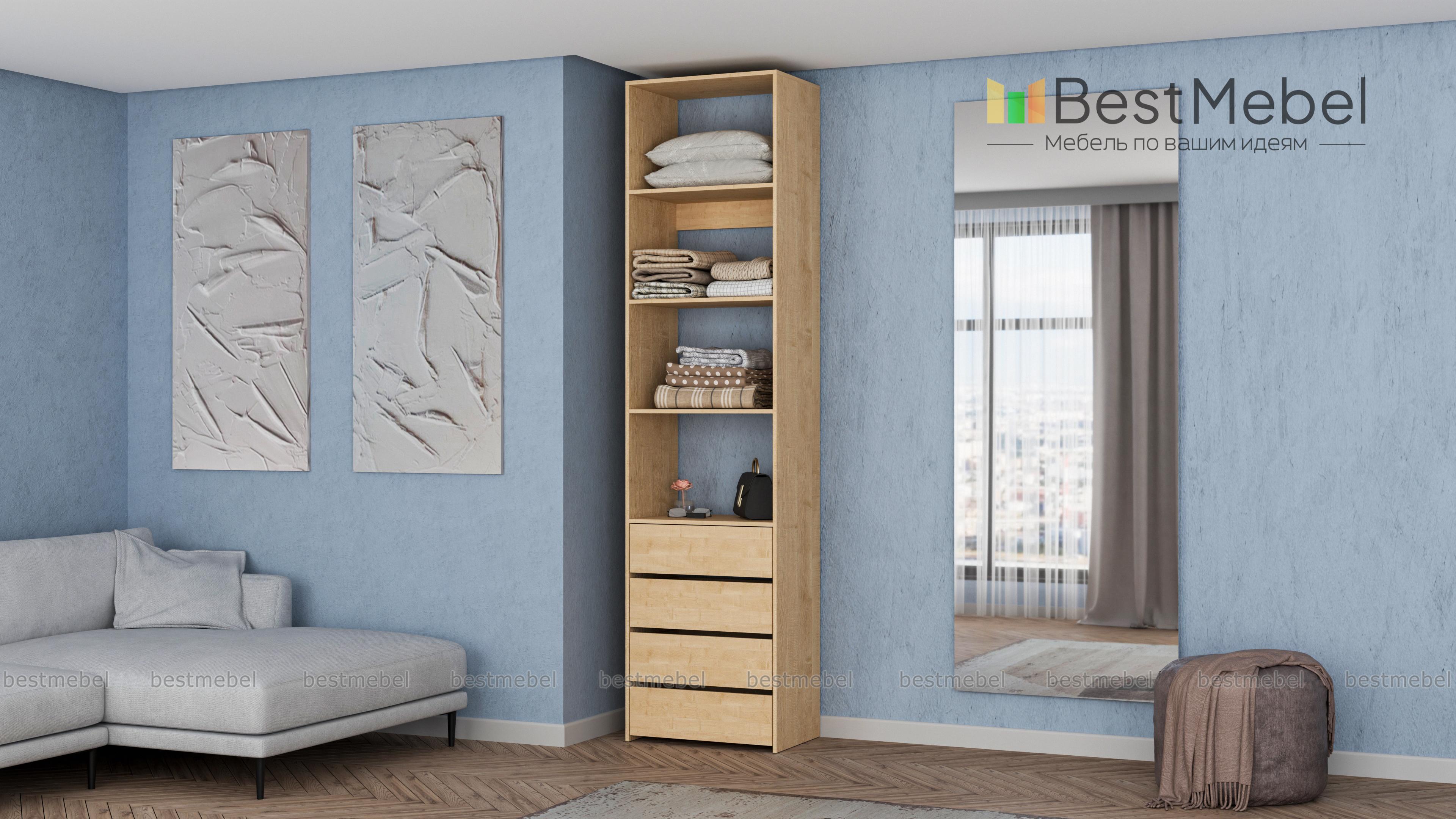 Стеллаж для одежды Мирта 35 BMS может дополнить другие стеллажи серии или использоваться самостоятельно. Три бельевые полки сверху дополнены четырьмя выдвижными ящиками для трикотажа, аксессуаров и прочих мелких вещей. Узкий стеллаж легко вписывается в ниши, маленькие спальни, прихожие или гардеробные, решая проблему ограниченного пространства. Купить стеллаж для одежды Мирта 35 BMS приглашаем в наш интернет-магазин в любом размере и оттенке из каталога.