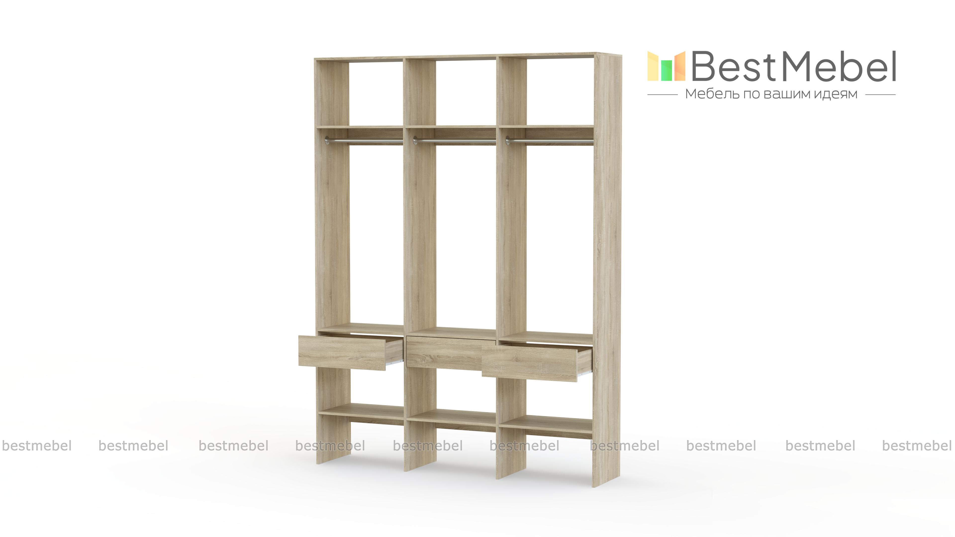 Стеллаж для одежды Мирта 51 BMS — визуально легкая и надежная конструкция из ламинированной ДСП, которую легко вписать в интерьер. Трехсекционный стеллаж прекрасно подходит для современных прихожих и гардеробных. Для вашего удобства три бельевых ящика и обувные полки располагаются снизу, а пространство над штангами занято полками для редко используемых вещей. Купить стеллаж для одежды Мирта 51 BMS вы сможете на сайте нашего интернет-магазина, подобрав цвет и размеры.