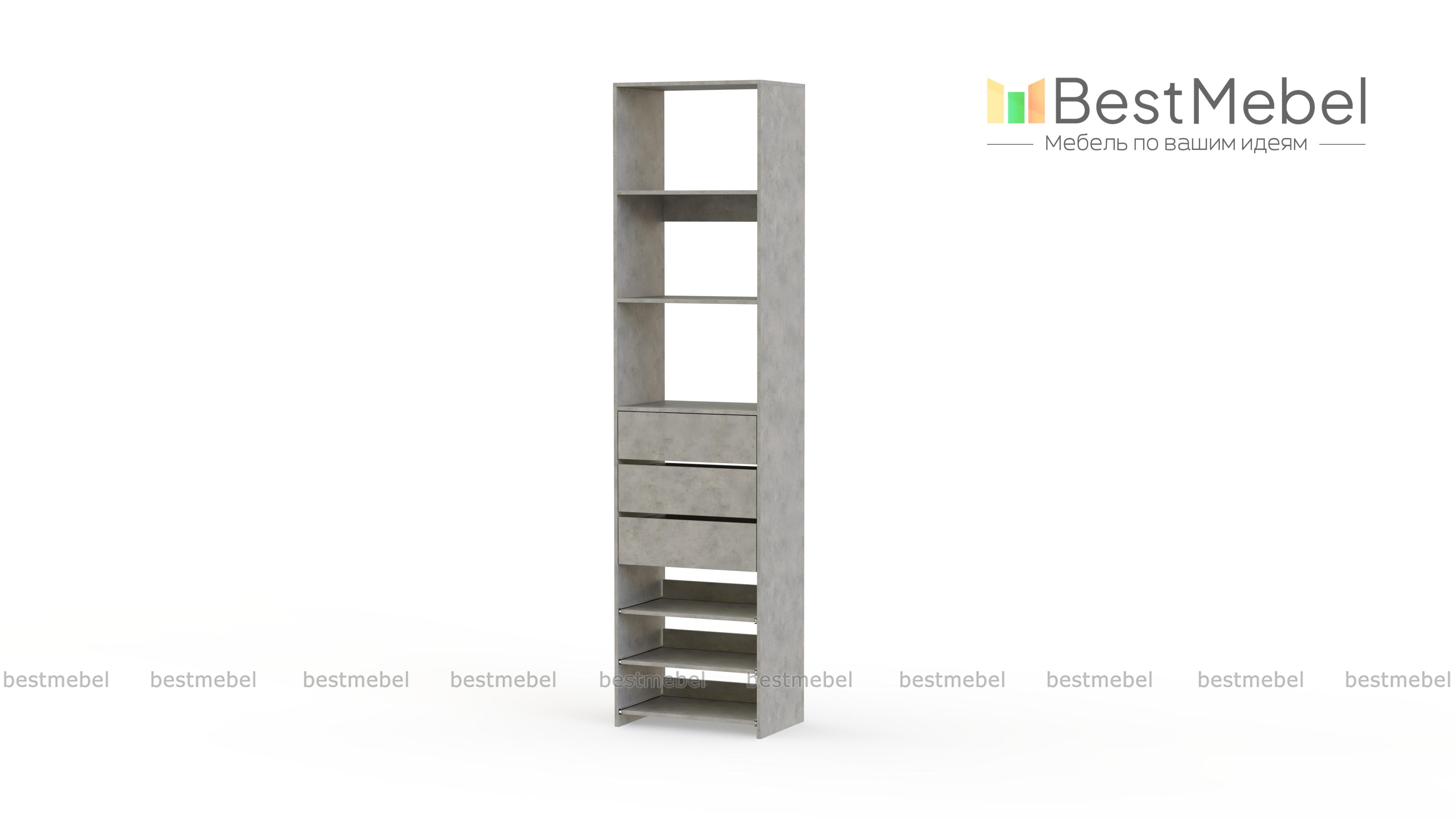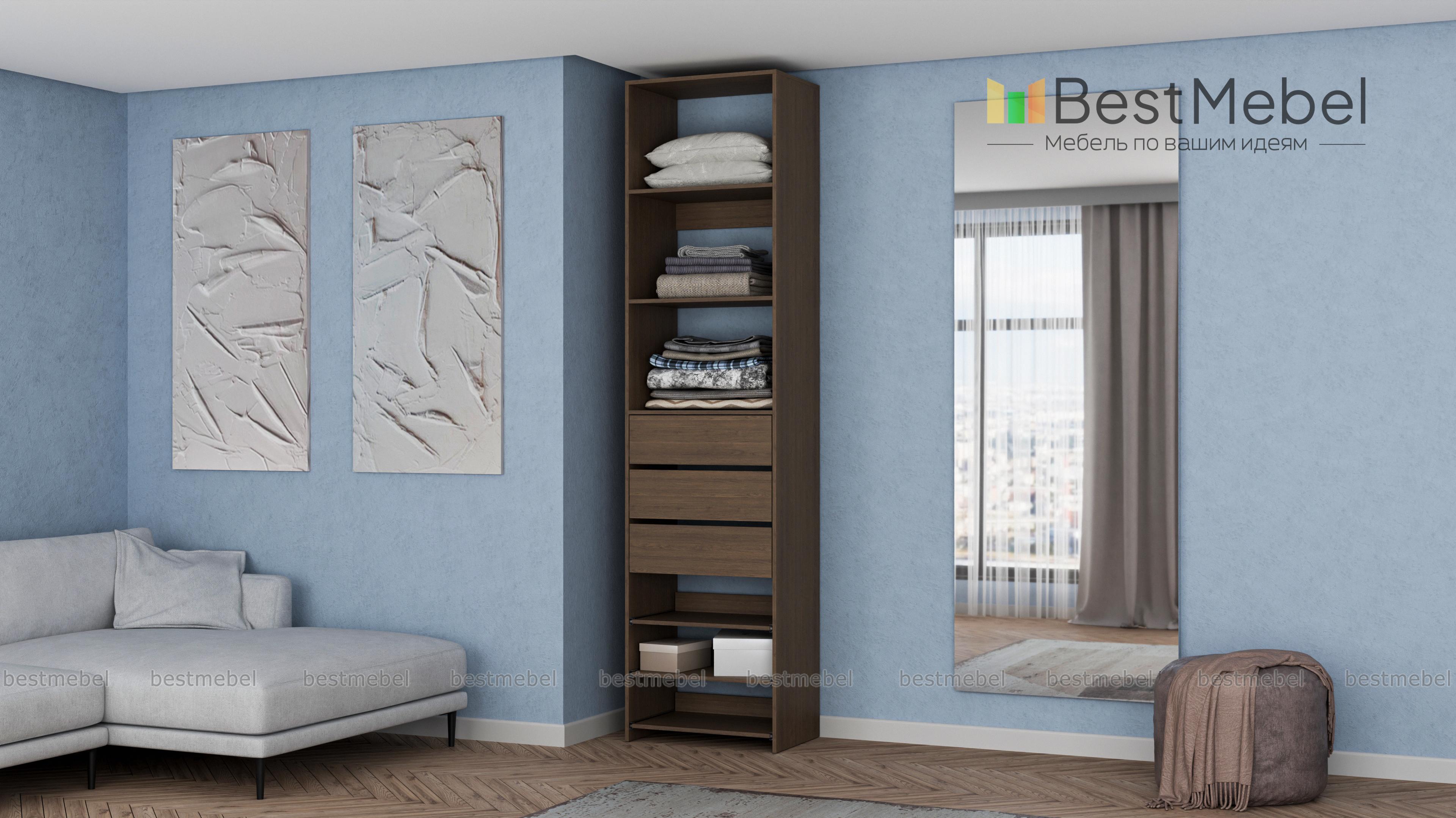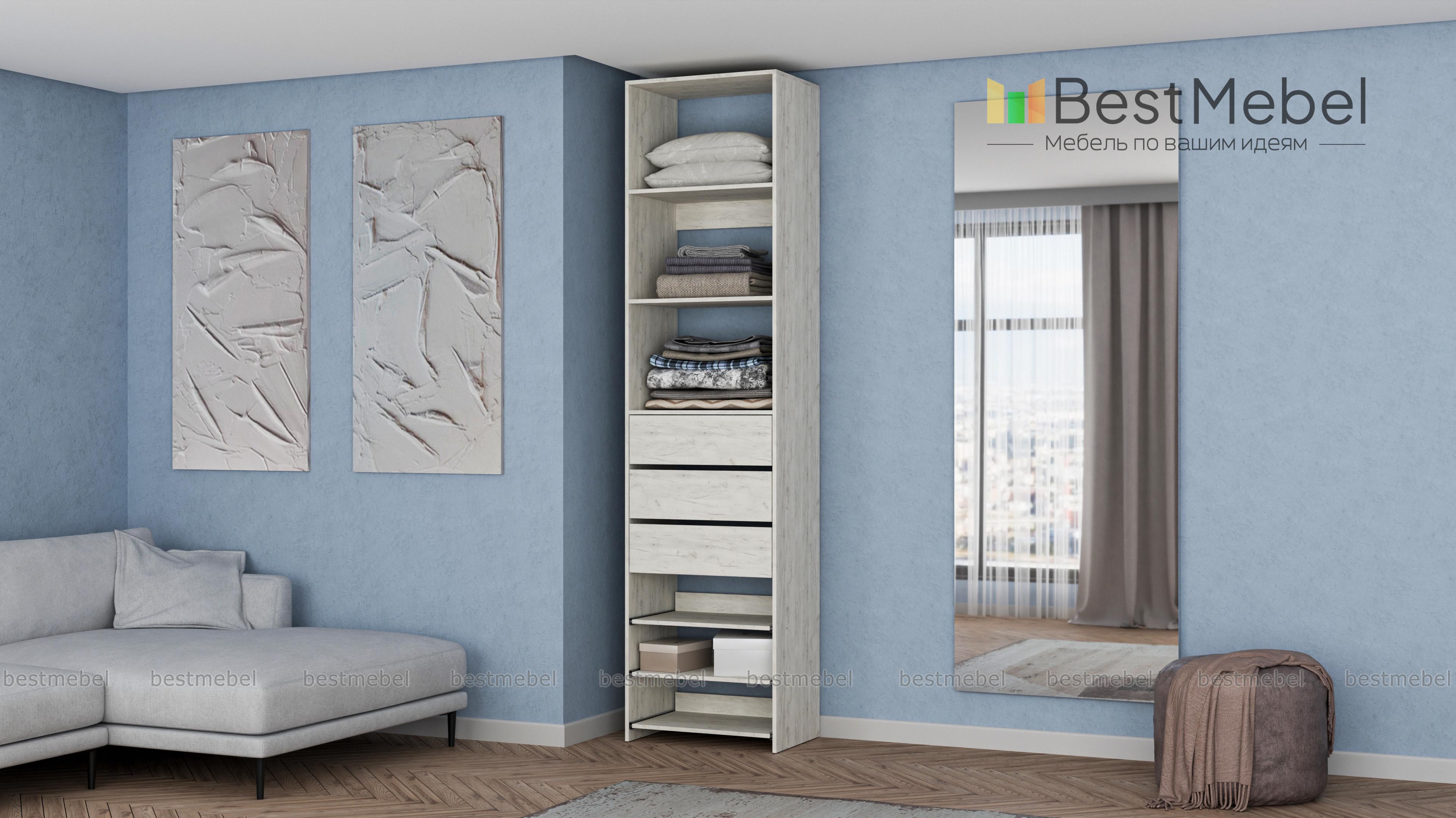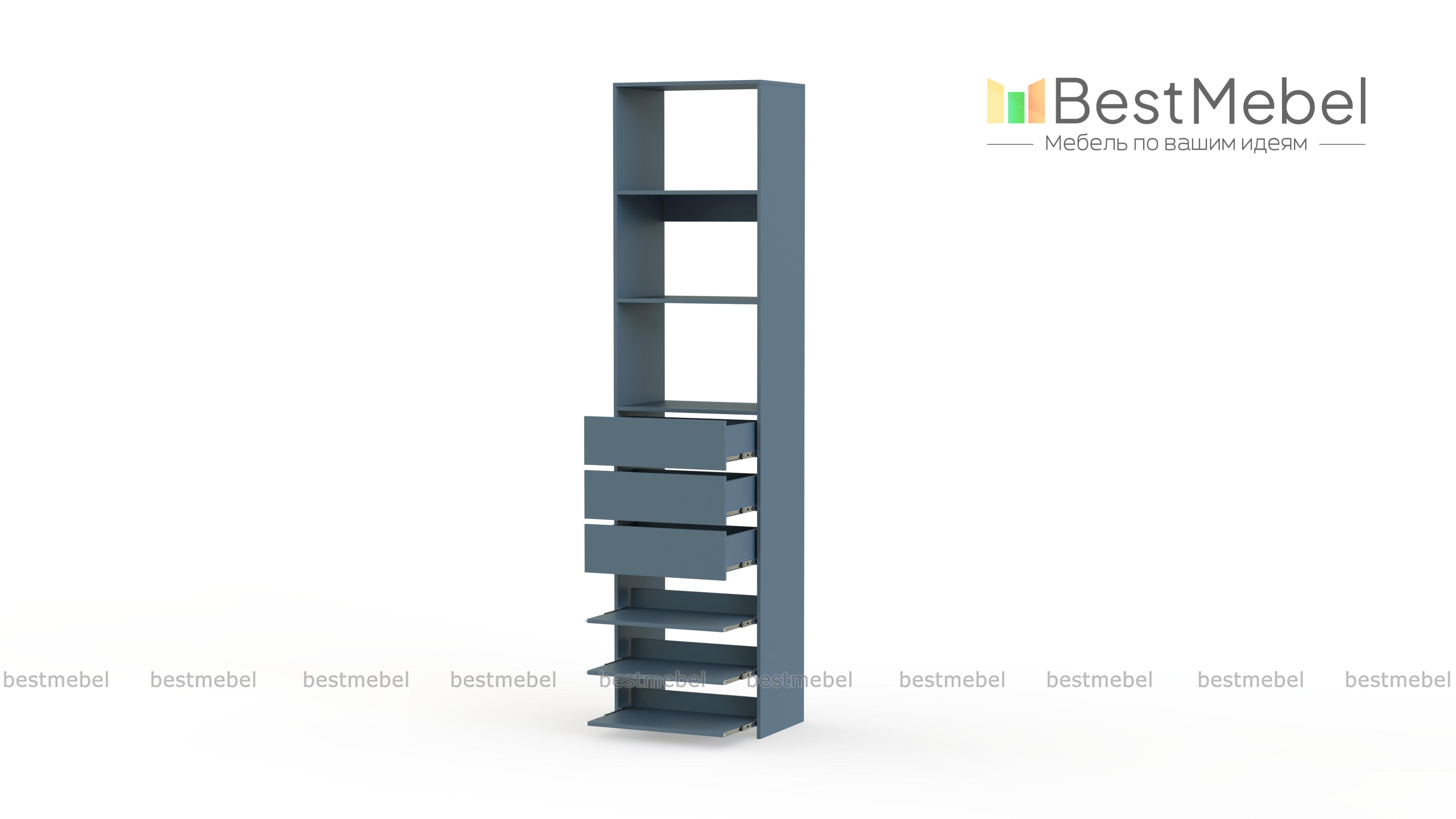 Стеллаж для одежды Мирта 77 BMS дополнит гардеробную систему или станет самостоятельным предметом меблировки. Односекционная модель оборудована тремя ящиками, стационарными и выдвигающимися полками для хранения одежды в сложенном виде, мелкого трикотажа, обуви и аксессуаров. Ламинированные поверхности влагостойкие и не требуют сложного ухода. Купить стеллаж для одежды Мирта 77 BMS, подобрав размеры и цвет под свой интерьер, можно на сайте нашего интернет-магазина.