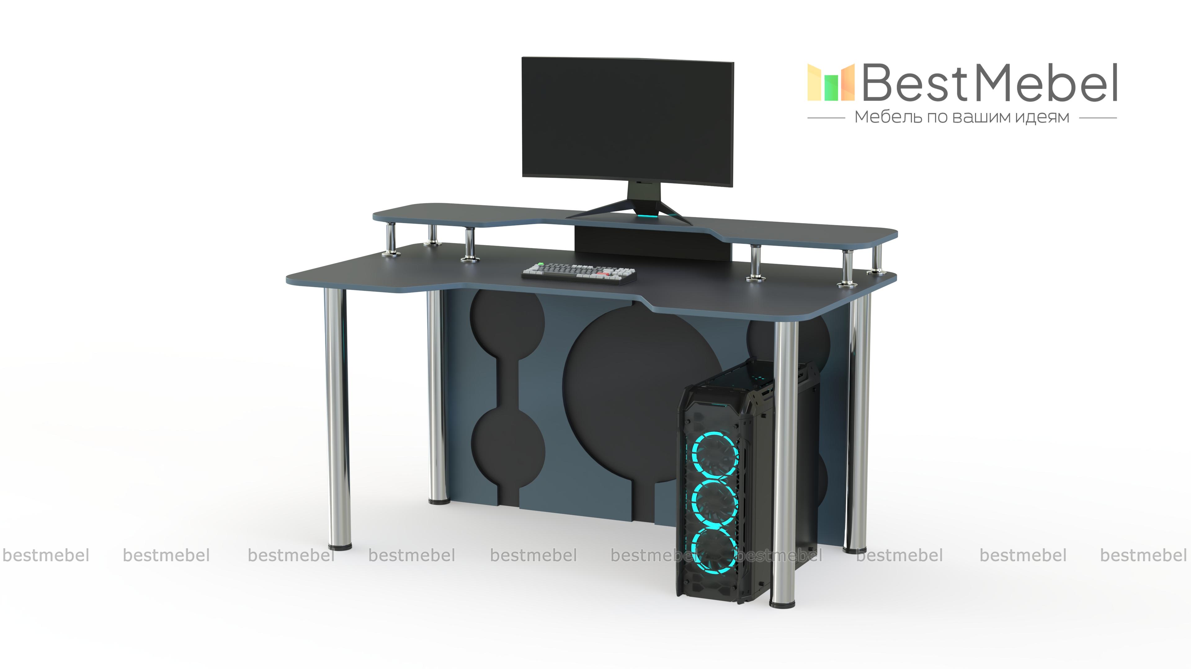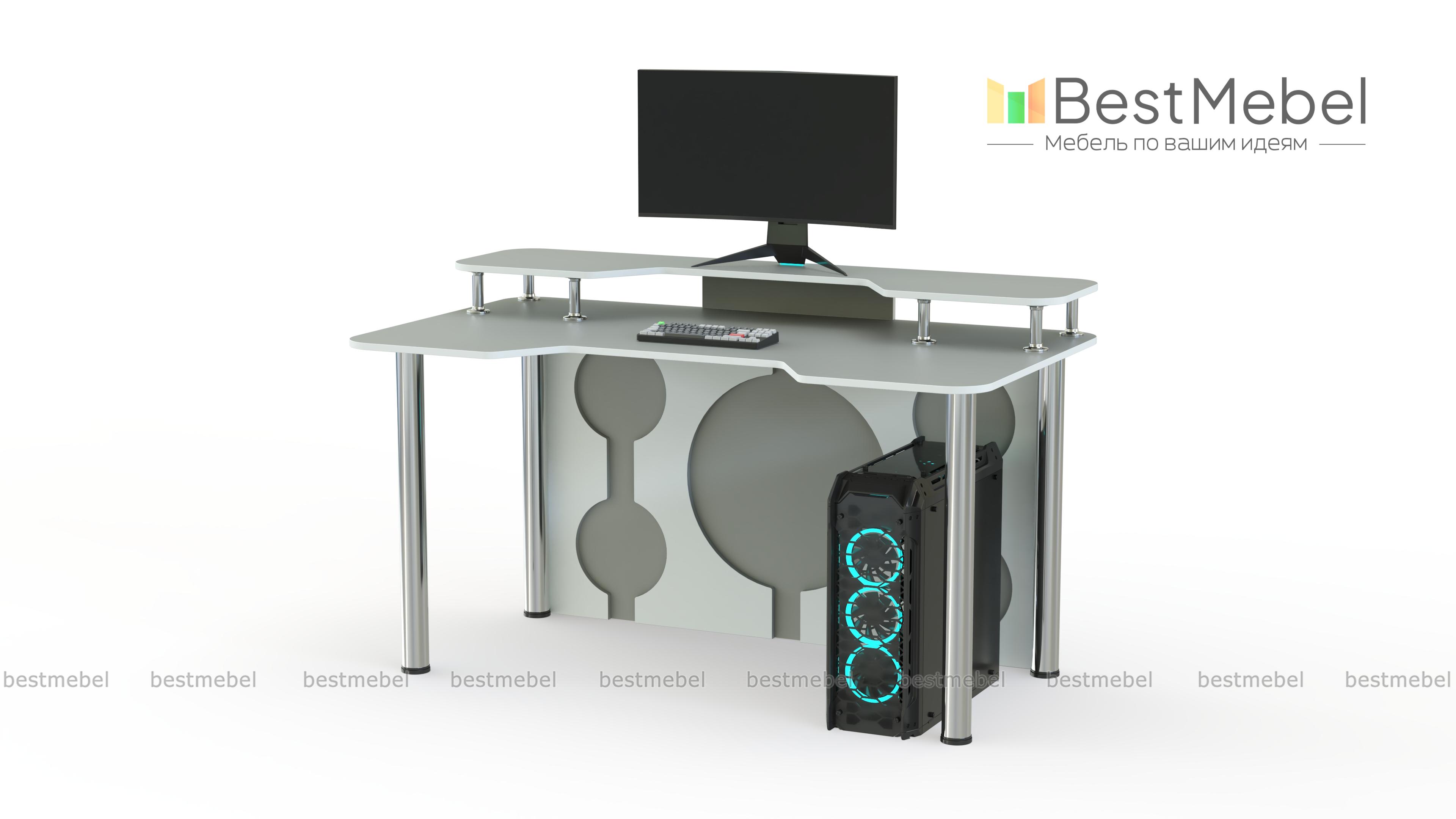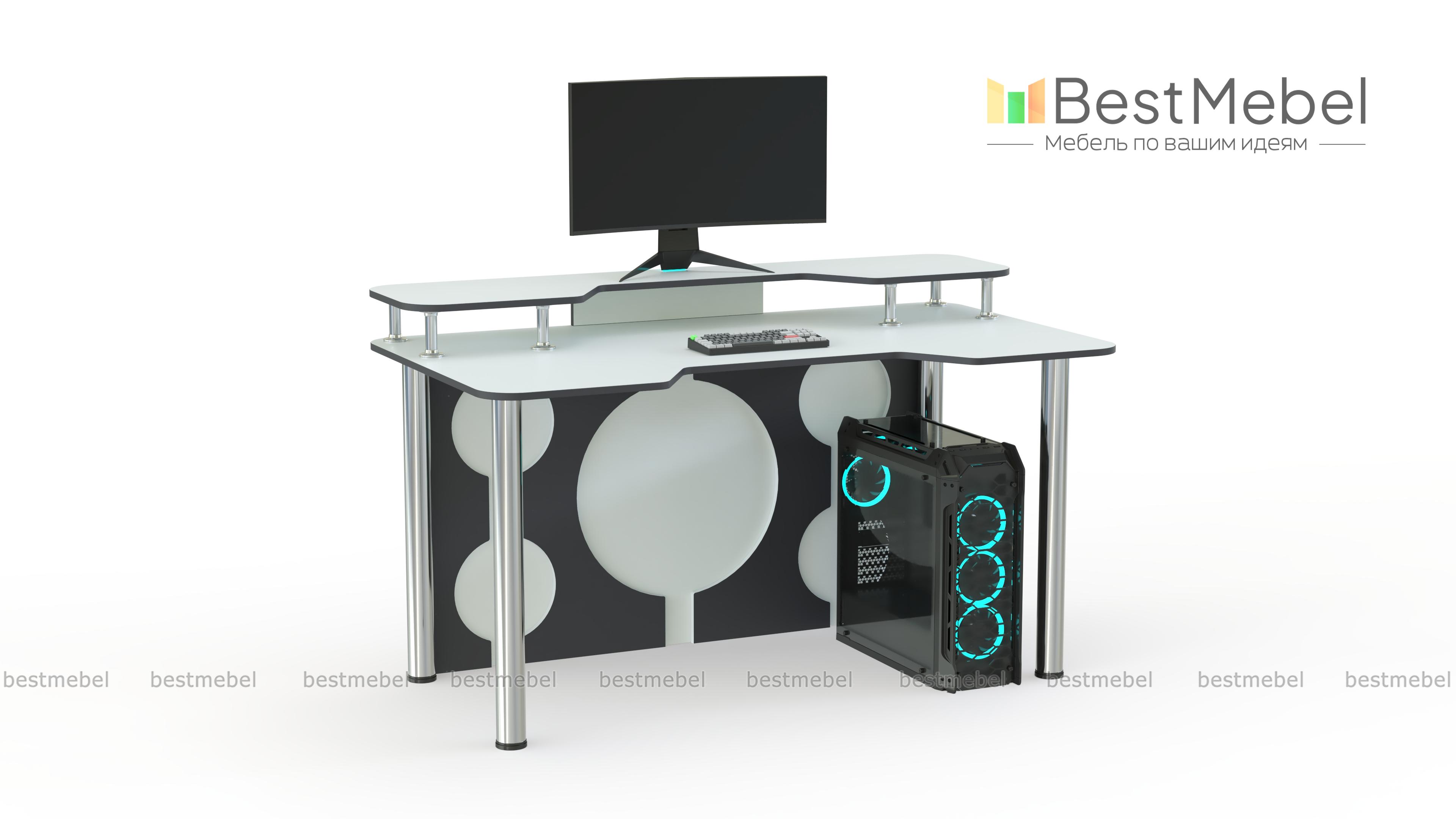 Игровой стол Европа 15 BMS эффектно впишется в современный интерьер и поможет обустроить комфортное геймерское пространство. Легкая и устойчивая благодаря регулируемым хромированным опорам, модель выполнена в контрастной черно-белой гамме. Столешница с эргономичной выемкой переднего края дополнена надстройкой под монитор и периферийные устройства, задняя стенка декорирована круглыми вырезами. Купить игровой стол Европа 15 BMS приглашаем в наш интернет-магазин с возможностью изготовления по индивидуальным размерам.