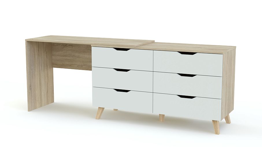 Туалетный столик Адам BMS – это многофункциональная модель, которую вы сможете использовать не только для хранения постельного белья, аксессуаров и разнообразных мелочей, но и для ухода за собой или работы за ноутбуком. Лаконичный комод в скандинавском стиле оборудован шестью выдвижными ящиками с ручками-вырезами, высокими скошенными ножками и совмещен со столом. Купить туалетный столик Адам BMS, выполненный в сочетании древесных тонов и белого, приглашаем в наш интернет-магазин.