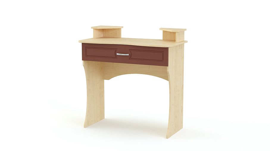 Туалетный столик Афродита 10 BMS выполнен в классическом стиле и гармонично дополнит меблировку элегантной спальни в теплых древесных тонах. Модель с фигурно вырезанными опорами оборудована эргономичной столешницей с вместительным ящиком для мелочей и двумя угловыми надстройками с полочками и нишами. Фасад ящика декорирован неброской фрезеровкой. Купить Туалетный столик Афродита 10 BMS для комфортного ухода за собой вы сможете недорого в нашем интернет-магазине.