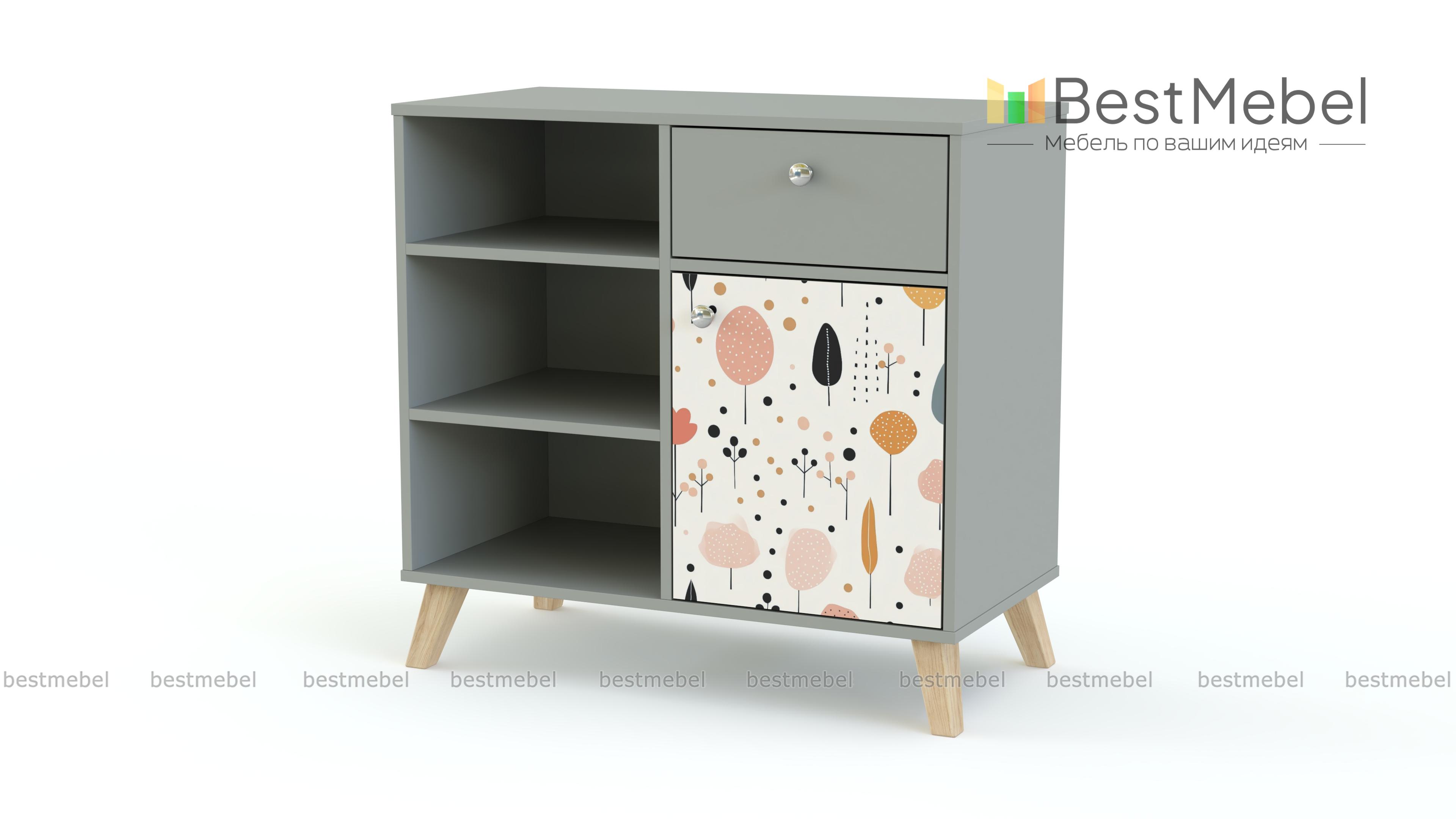 Тумба Эльза 4 BMS с высокими ножками в стиле сканди имеет простую удобную конструкцию, которой ребенку будет комфортно пользоваться. Слева располагаются полки для открытого хранения, а справа выдвижной ящичек для мелких предметов и распашная секция. На дверцу и ящик тумбы установлены эргономичные круглые ручки, распашной фасад украшает симпатичный нейтральный принт. Купить тумбу Эльза 4 BMS, вы сможете в нашем интернет-магазине, подобрав размеры, цвет и фурнитуру.
