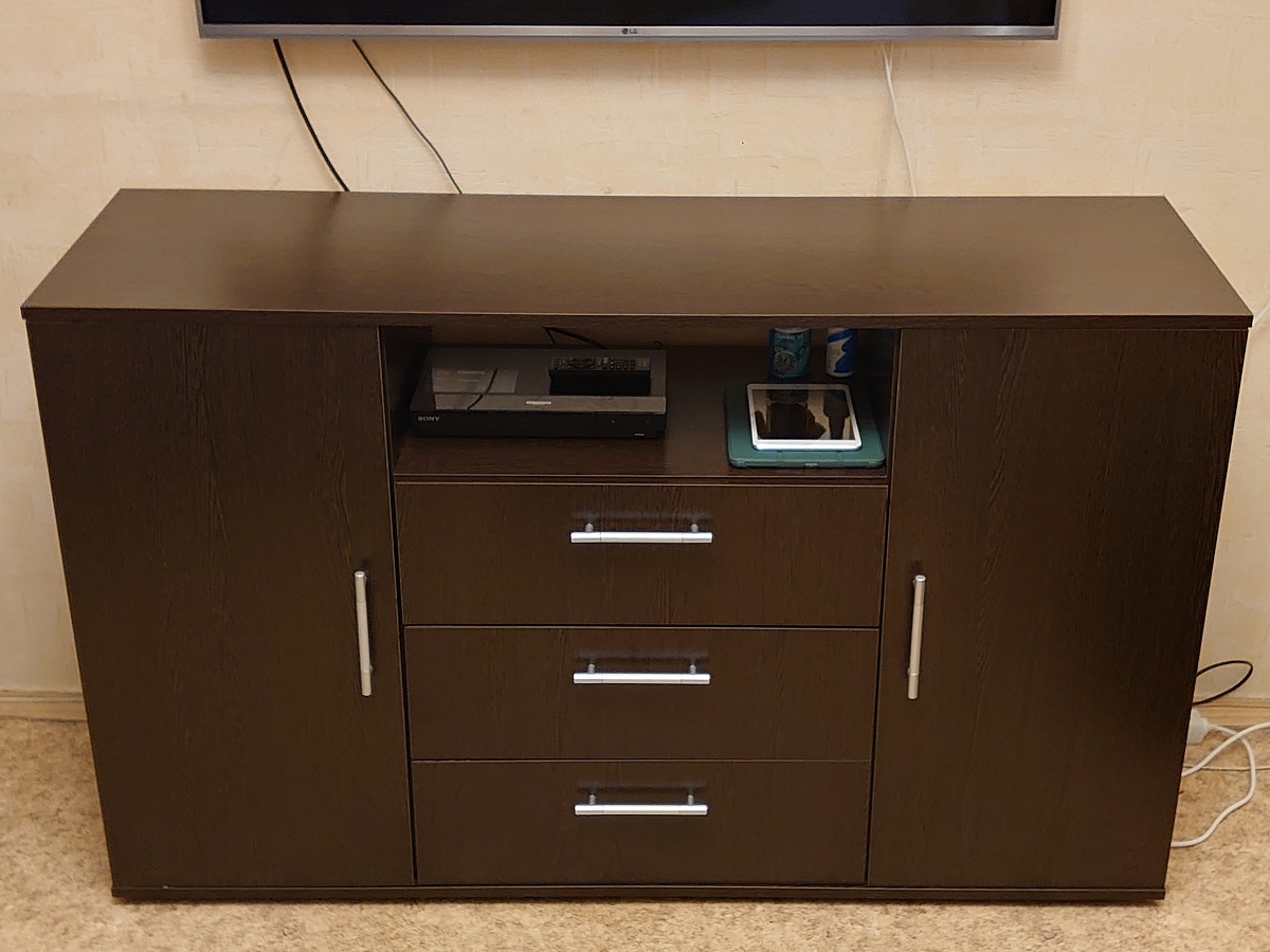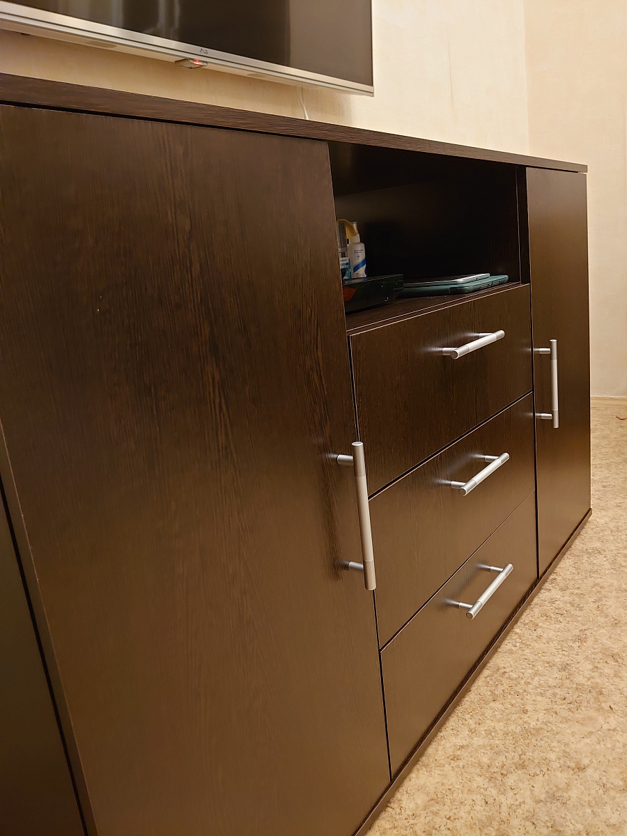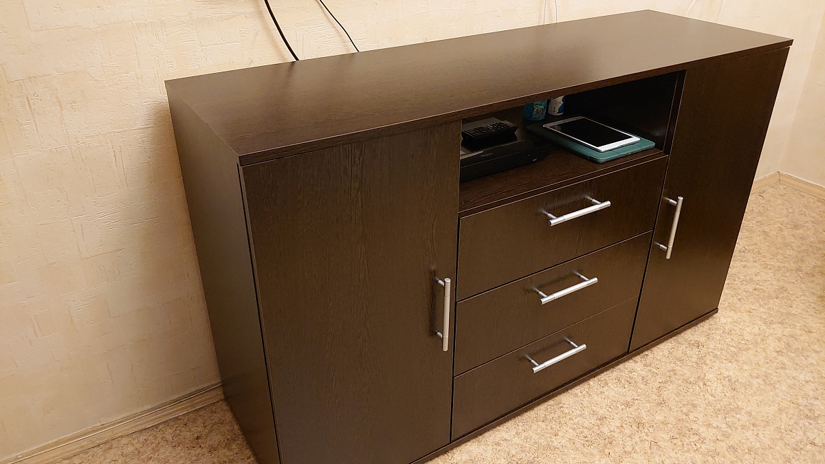 Заказывал тумбу Мишель в этом магазине по своим размерам 1400х850х450 в цвете Венге Цава (заказ №00000888634). Понравилась возможность визуализировать изделие до покупки и вносить изменения в конструктив — попросил добавить третий выдвижной ящик. Изготовили и доставили в кратчайшие сроки. Упаковано хорошо, панели и прочие детали без следов повреждения. Собирал сам. Справился, в комплекте шла схема сборки, но хотелось бы, чтобы клали ещё какую-нибудь инструкцию более подробную. Крепежа хватило.В целом всем доволен. Смотрится отлично, вместительна, сочетает в себе функции и комода. И телевизор при необходимости можно поставить, но он у меня уже на кронштейне был)Спасибо большое магазину за качественную и функциональную мебель, теперь знаю, к кому обращаться