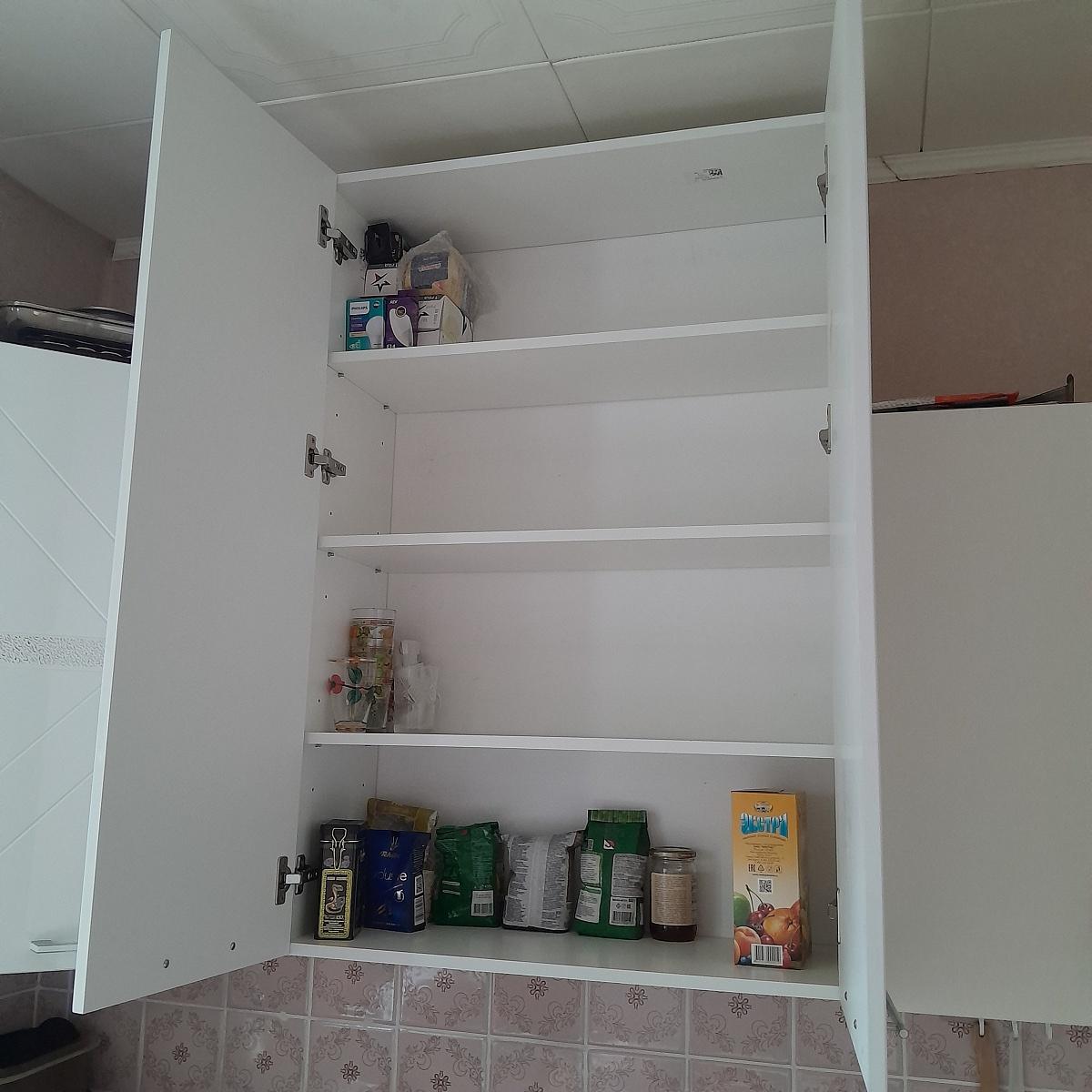 Заказ 00000733130. Заказал высокий и широкий шкаф, чтобы занять пустое место между навесными шкафами на кухне. Благодаря возможности выбора необходимого размера, получил именно то, что хотел. Фурнитура, материал фасада и корпуса качественные, цвет чистый, ровный. Заказа дополнительную полку, чтобы увеличить вместимость. Благодаря двум дверцам и петлям с доводчиком открывается и закрывается шкаф легко. Все в комплекте, доставили все быстро и в сохранности.
