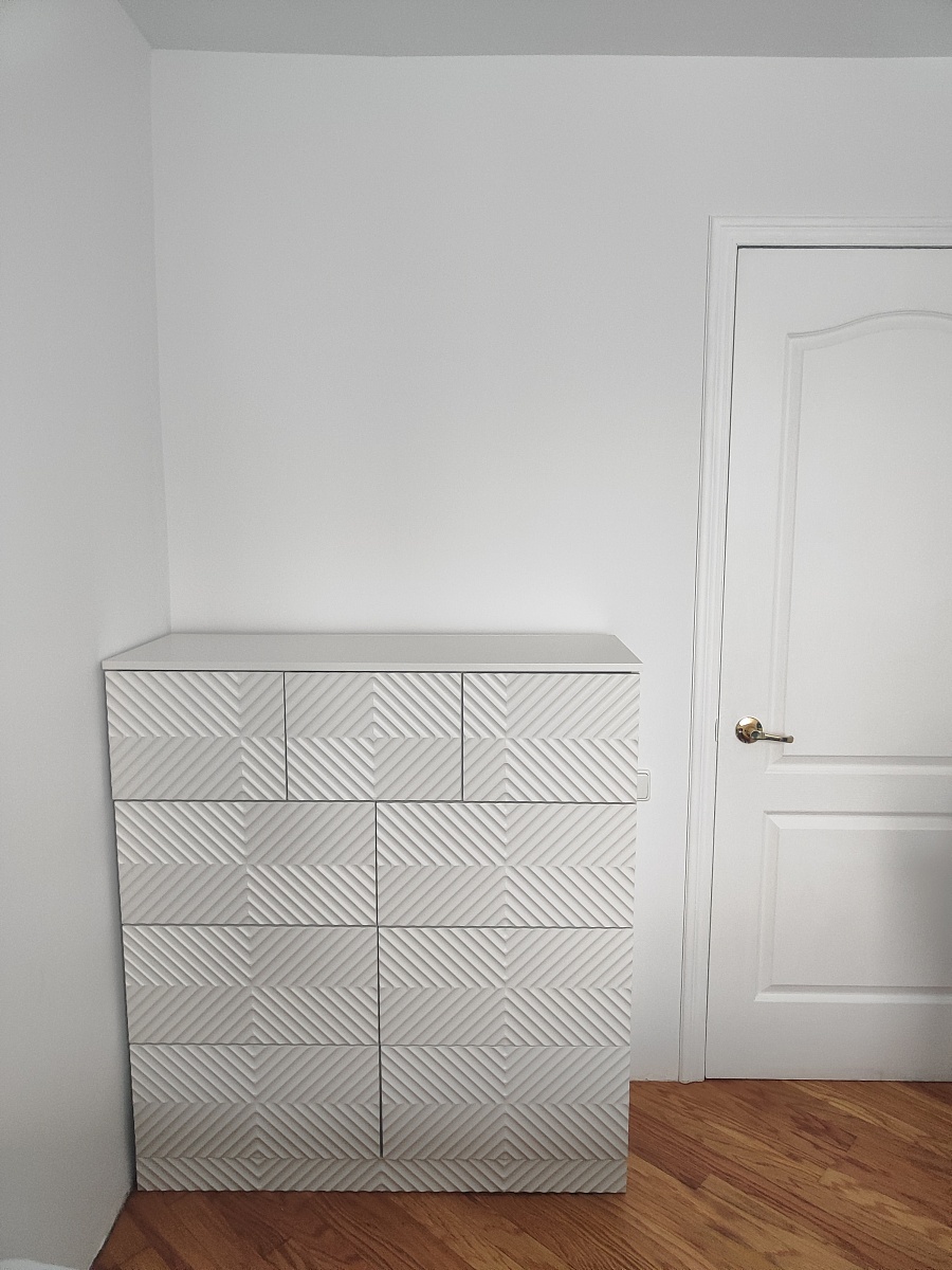 Собрали комод, который сами для себя придумали на основе имеющихся образцов с 9-ю выдвижными ящиками. Фасады с фрезеровкой выполнены и подогнаны очень хорошо. Рисунок был сложный, но все совпало и получилось очень красиво. Отдельное спасибо за нижнюю планку фасада на цоколь- получился единый рисунок и современный внешний вид. Есть замечания по глубине ящиков,  т.к. в собранном виде ящики не доходят до задней стенке на 6 см. Как-то этот момент не согласовали. Думаю, сто можно было на 5 см точно увеличить глубину ящиков, что было бы функциональнее, т.к. комод это не только фасад, но и шкаф для вещей, постельного белья и Эти 5см я учитывала  при  выборе размера комода.  Если проблема в фурнитуре, то можно было это обсудить. А так, нам теперь с этим жить. Ещё сборка тоже в некоторых местах не продумана ( центральные внутренние отверстия под симметричные направляющие почему-то одно сквозное. Получается, что направляющие  с одной стороны прикрутили, а потом с другой стороны центральной стойки в те же отверстия нужно прикручивать  с другой стороны направляющие. Шурупы ломаются друг о друга и конструкция кривая. Пришлось подгонять самим. Не хватило  2-х больших шурупов для сборки корпуса. Думаю, что лучше больше класть, чем меньше. Это уже 2-й наш большой заказ. В любом случае большое спасибо, что Вы воплощает наши мечты! Отдельное огромное спасибо инженеру-конструктору и мастеру по внешнему виду фрезеровки. Получилось ОГОНЬ!