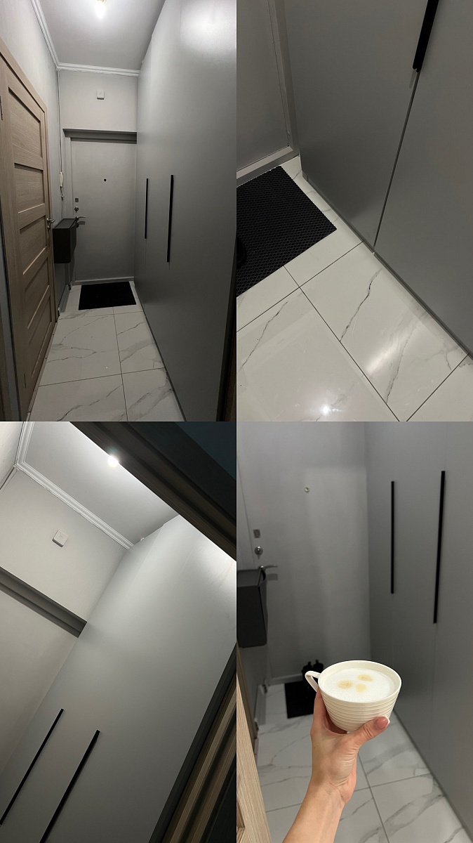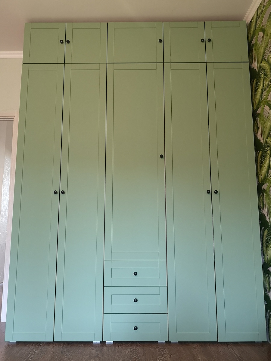 Цвет смотрится стильно и дорого. Полностью все меняла под себя в конструкторе. Наши размеры: высота 2,7м. Глубина всего 30 см, ширина 160. Для таких параметров цена-подарок. Ручки заменила на современные. Получился клевый шкаф в потолок за 42 тыс