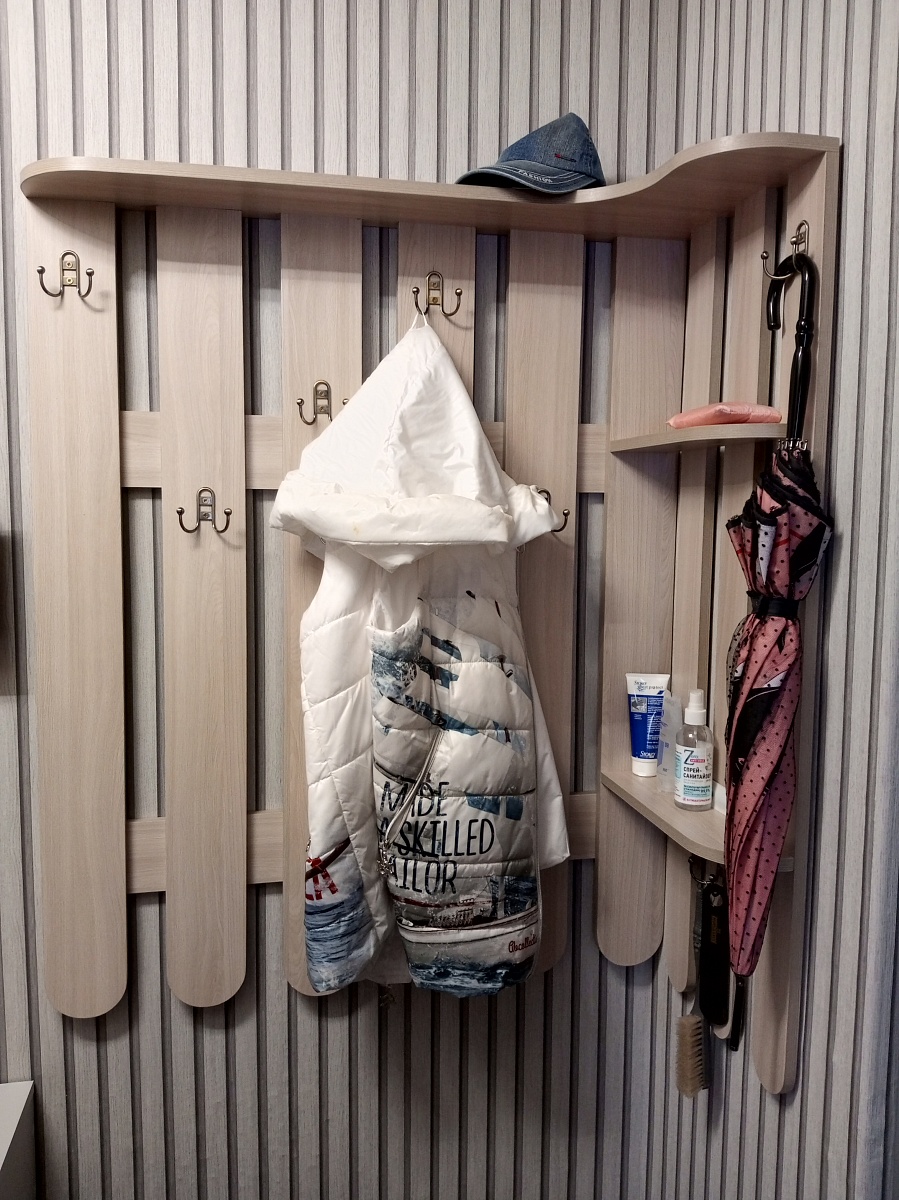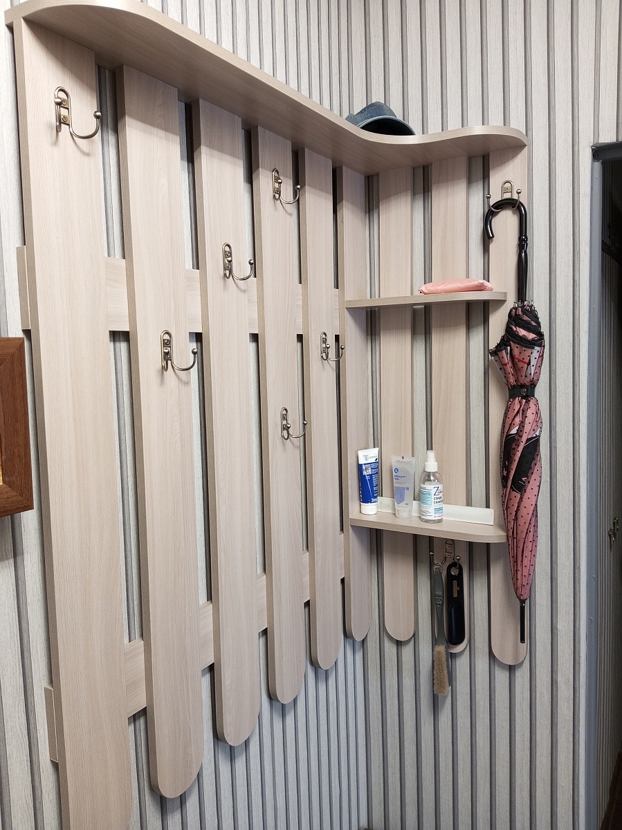 Заказ 973969. Прекрасная вешалка, есть полочка для головных уборов и полоски для мелочей. Крючки можно прикрутить так где удобнее, специальной разметки нет. Собирали сами. Очень нравится, что можно выбрать свои размеры и цвет. Вешалка прекрасно смотрится как комплект с обувницей Харлей12.