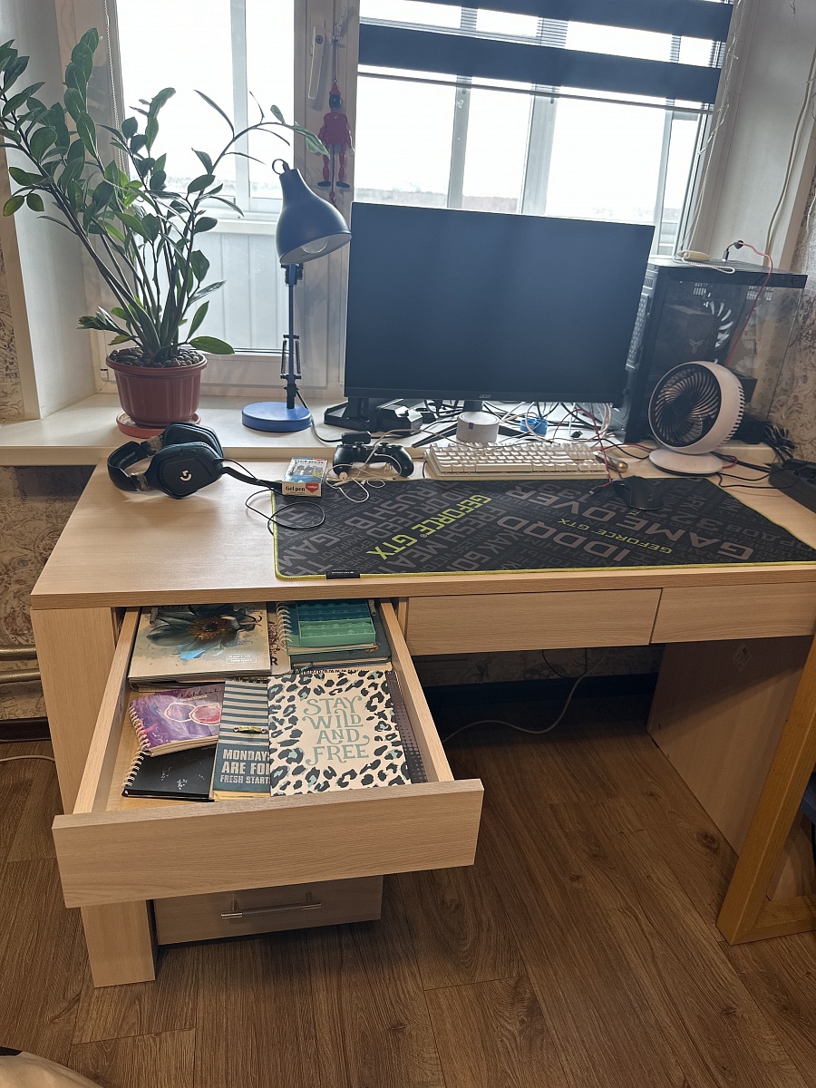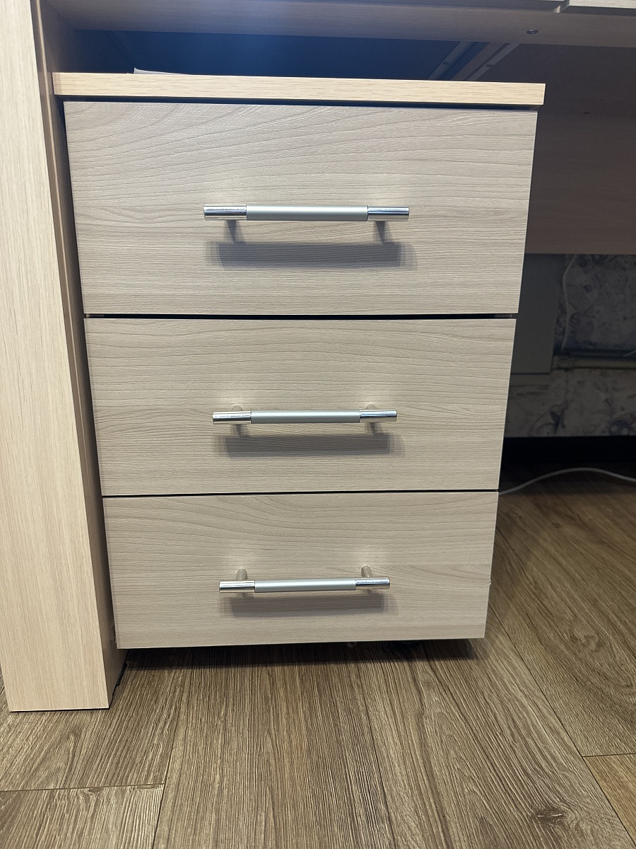 Прекрасный, большой и очень удобный стол! Сделали по индивидуальным размерам! Всё продумано до мелочей для комфортной работы и учебы!Очень нравятся выдвижные глубокие ящики под столешницей! Большая тумбочка вмещает все учебники и тетради! Стол привезли через 2 недели, всё аккуратно было упаковано, собирали сами за один вечер. Спасибо Вам большое! Заказ 00000640831