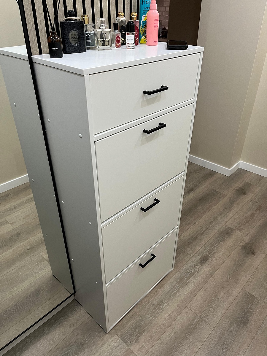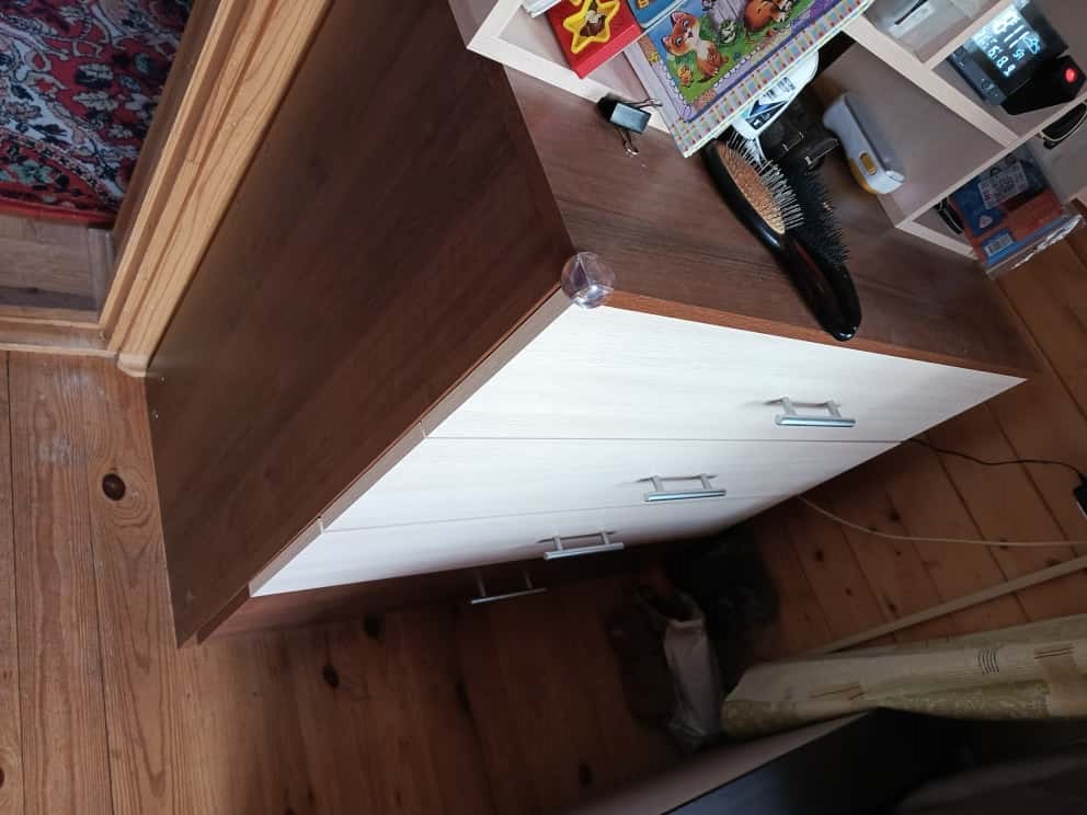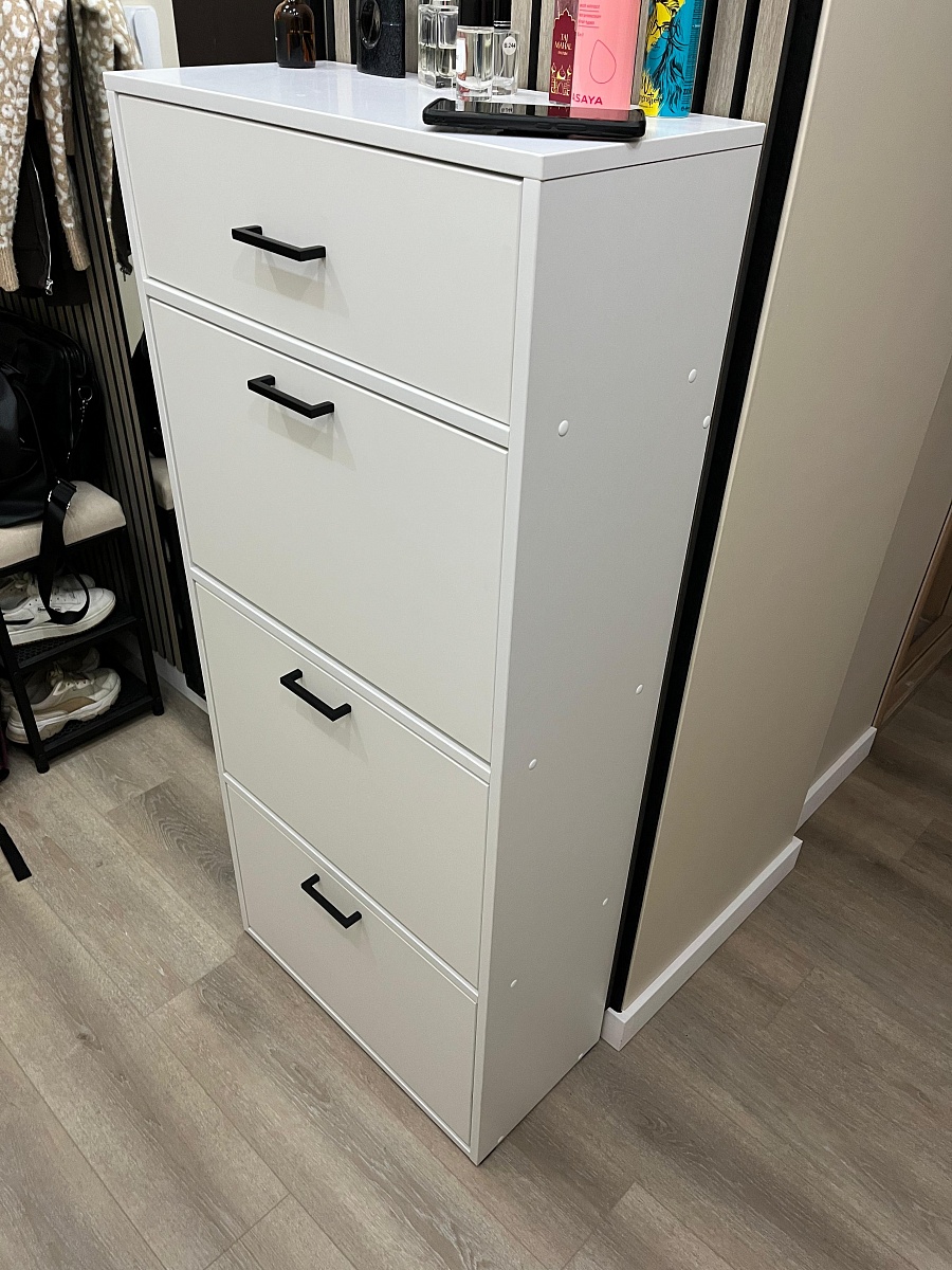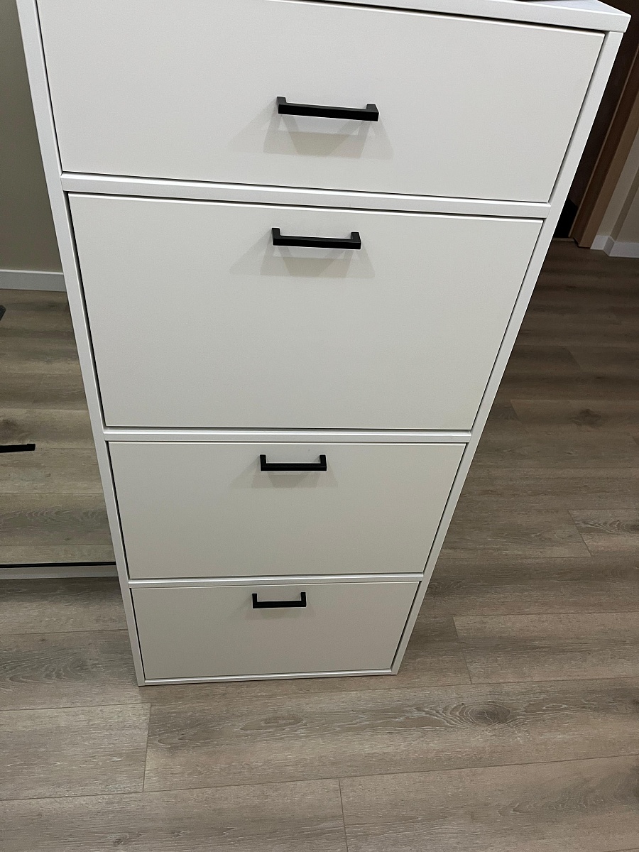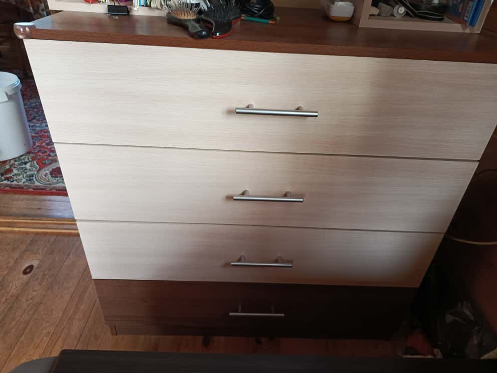 Заказ 00000154258, изделие Комод Эвелин BMS (900х900х460).Очень удачный вариант комода. 4 ящика - хватит всем членам семьи , чтобы разложить вещи. Получилось подобрать размер и цвет под "угол" на даче. Бюджетно и добротно. Из минусов - острые углы, обязательно добирайте накладки. В остальном рекомендую, мебель удобная. Даже с простейшей фурнитурой пока проблем нет.